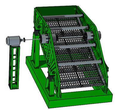單軸振動篩有一個十分牢靠的篩箱,因?yàn)槠浣Y(jié)構(gòu)是焊接及鉚接而成,在振動器的主軸上不僅中間位置有偏心軸,而且主軸兩頭也有能夠調(diào)節(jié)的偏心輪。在篩分時,電動機(jī)經(jīng)由三角帶作用于振動器,傳動軸使偏心軸及偏心輪產(chǎn)生慣性力,這種慣性力會令篩箱作近似的圓形的運(yùn)動,使物料得到了最佳的篩分效果。
